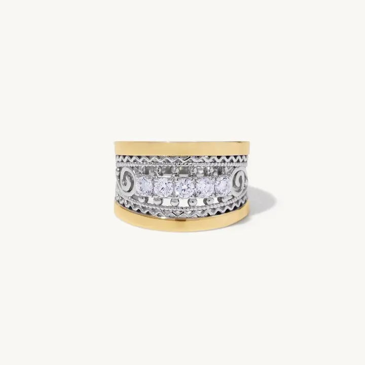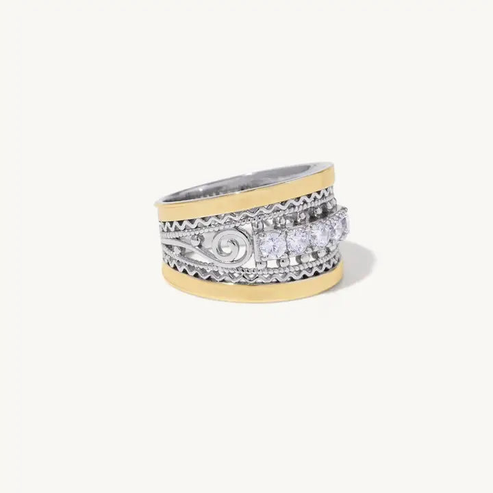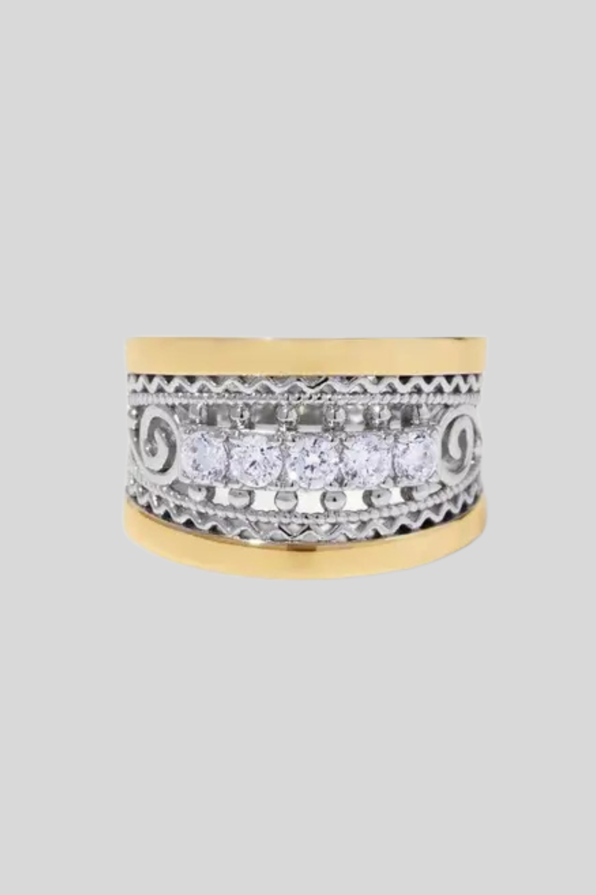 5 crystalline cubic zirconia's are displayed between an artfully made filigree sterling silver and 14k yellow gold band.
