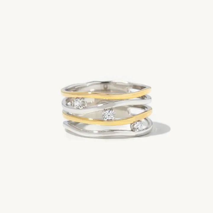 925 sterling silver and 14k yellow gold. Features three crystalline cubic zirconia gemstones.